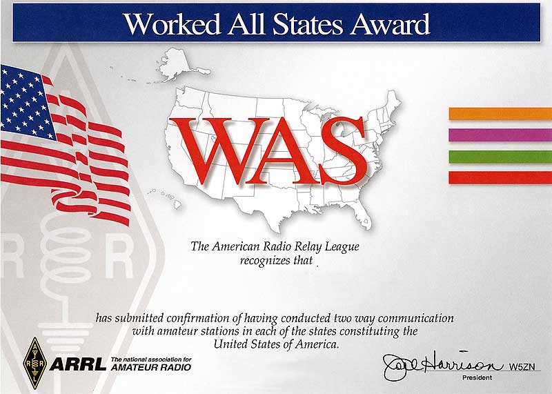 There are "certificate chasers" on the Ham Radio bands who work for certificates that demonstrate how good an operator or how good their station works. Such as worked All States (WAS) award shown to the left. An award is earned by the Ham Radio operator for establishing two-way communication (or "working") with other amateur radio stations. Awards are sponsored by national amateur radio societies, radio enthusiast magazines, or amateur radio clubs, and aim to promote activity on the amateur radio bands. Each award has its own set of rules and fees. Some awards require the amateur radio operator to have contacted other stations in a certain number of countries, Maidenhead grid locators, or counties. Because amateur radio operators are forbidden by regulation to accept financial compensation for their on-air activity, award recipients generally only receive a certificate, wooden plaque, or a small trophy as recognition of their performance.